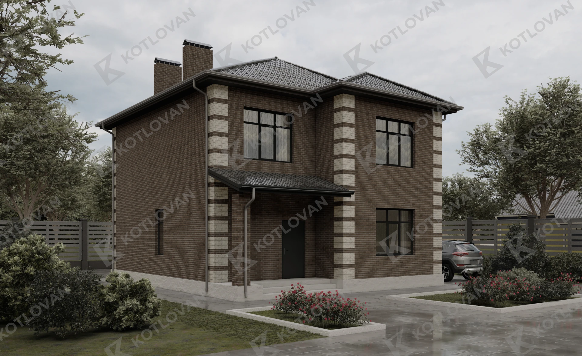 Двухэтажный дом, фасад исполнен в двух цветовых решениях: коричневый и бежевый кирпич. Также выполнена ламинация окон под цвет кирпича.