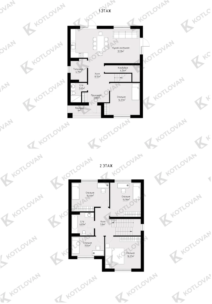 Второй этаж - приватная зона отдыха: три детские спальни (15 м и 9 м), ванная комната (6,87 м) и родительская спальня (16,27 м).